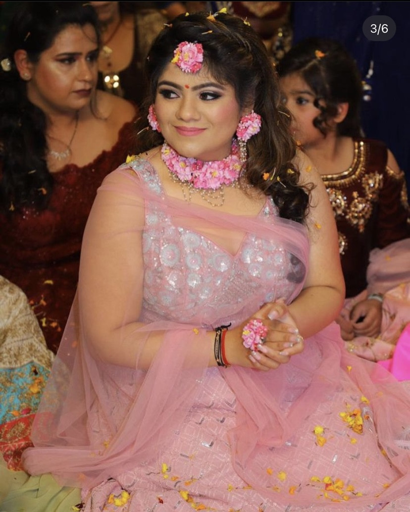 Bride is wearing floral jewellery which includes customised name bangles , earrings, Mangtikka & necklace for her mehndi ceremony.