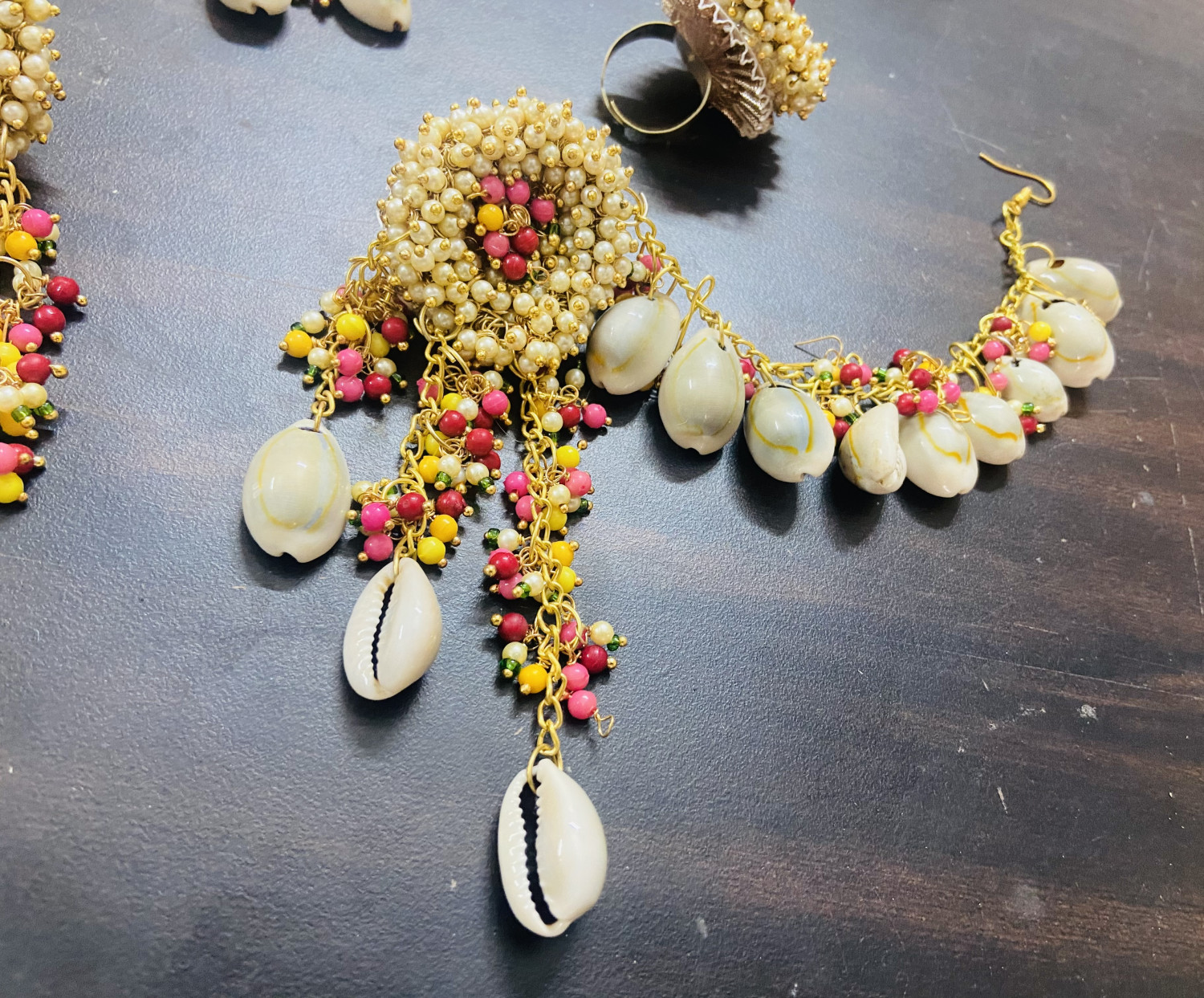 Colourful shell jewellery includes mangtikka , hathphools , anklets & earrings with side layers.