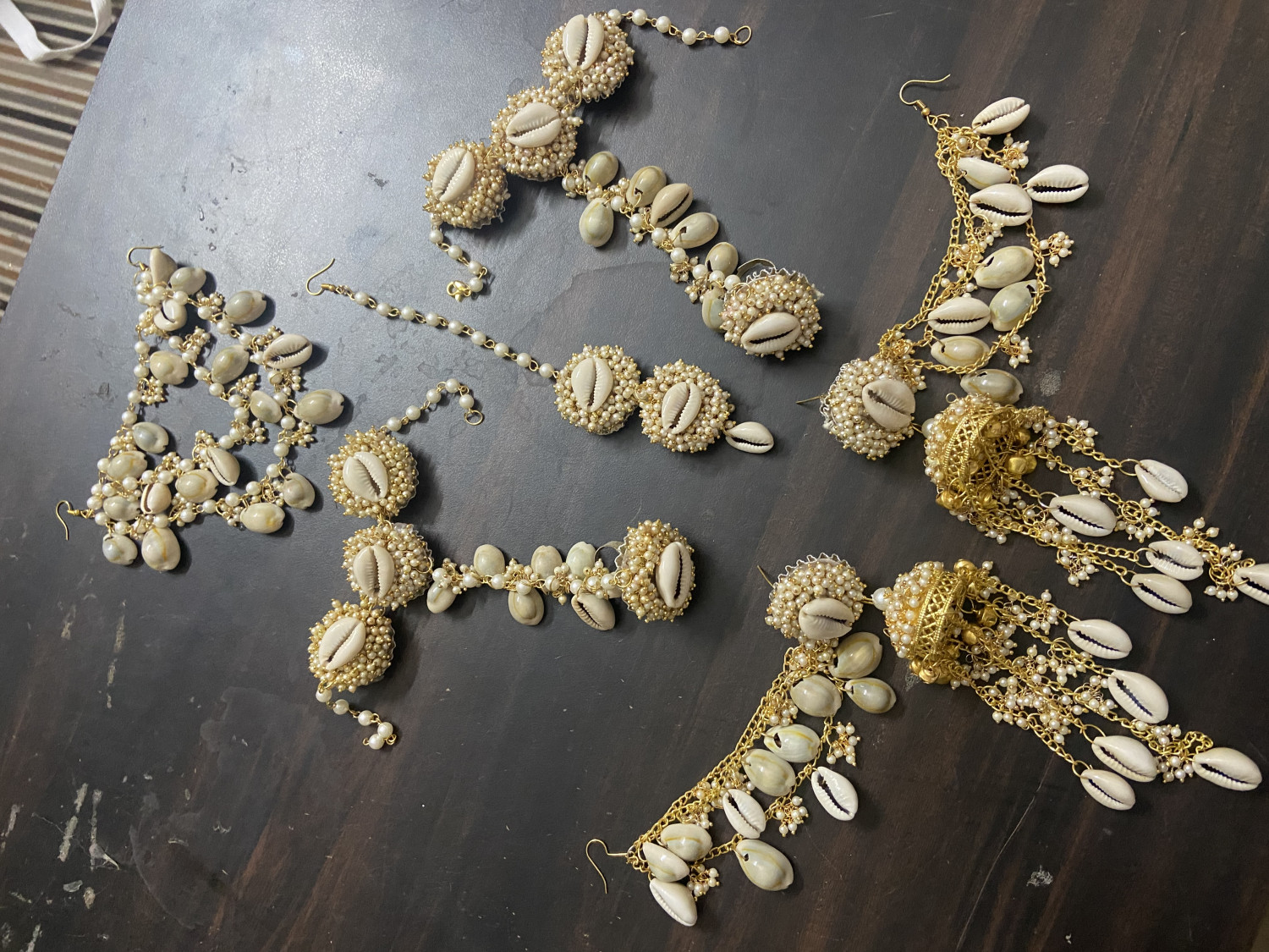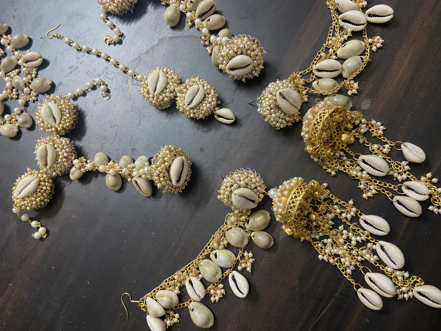 Shell jewellery consists of hathphools, earrings with side layers, mangtikka & hair accessory.