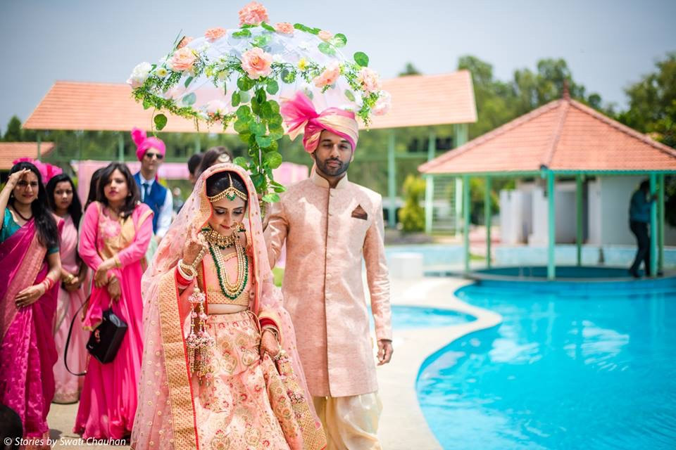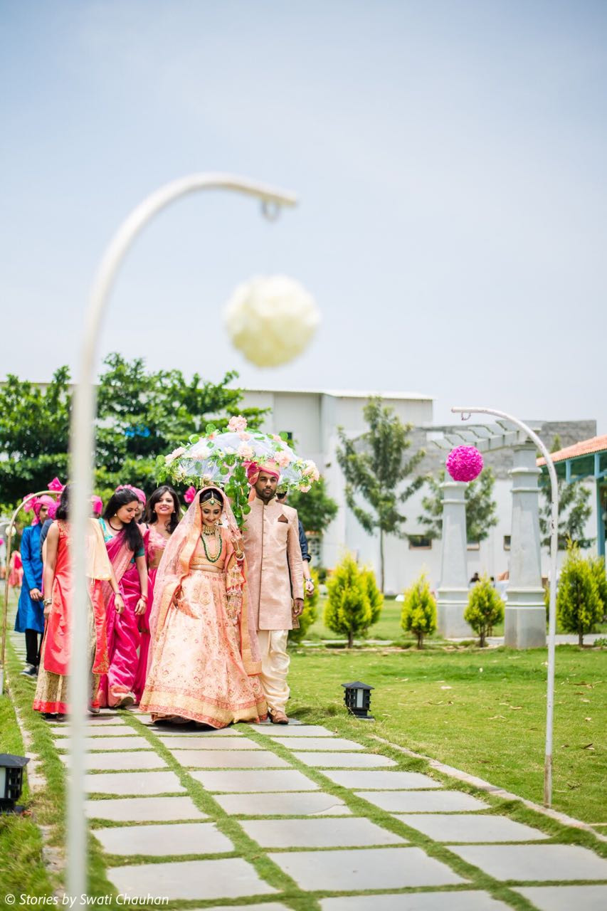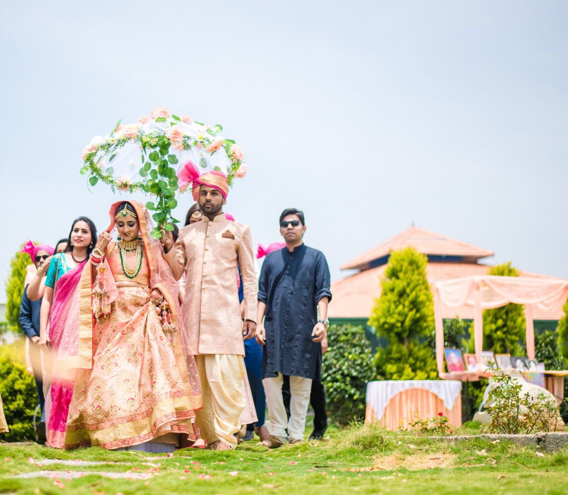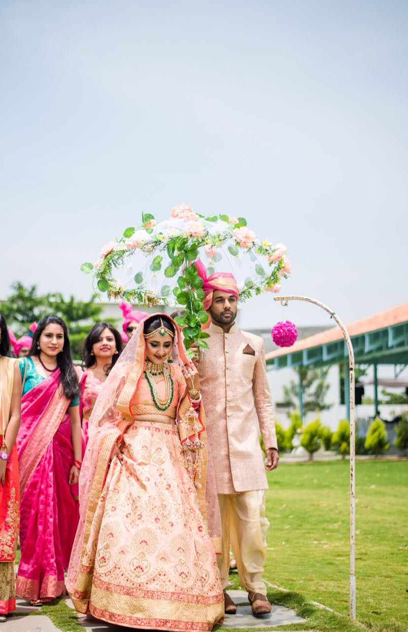 Bride is carrying floral umbrella complementing her bridal outfit.