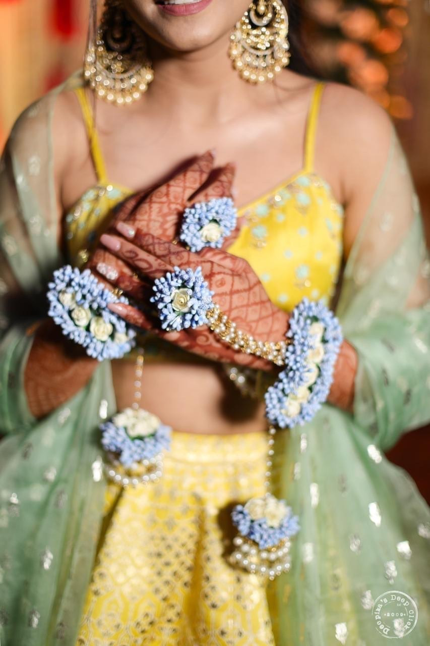 Bride is wearing floral jewellery which includes hathphools for her haldi ceremony.