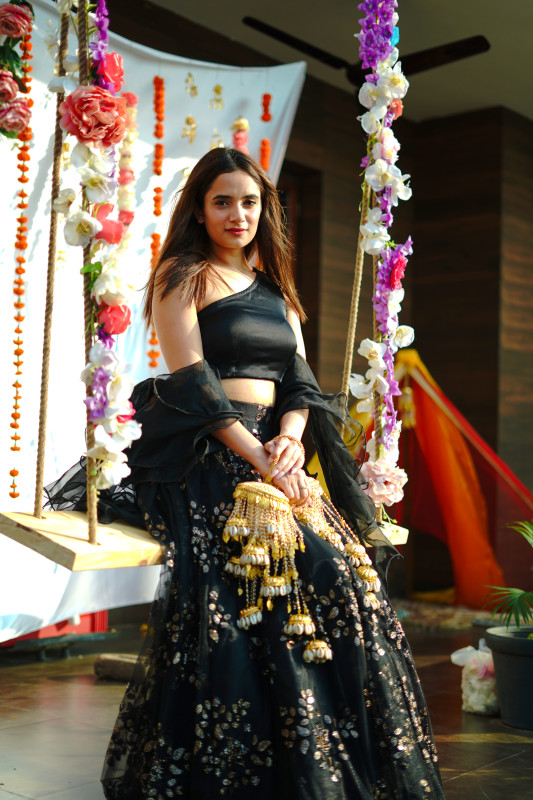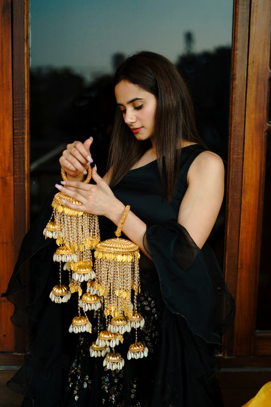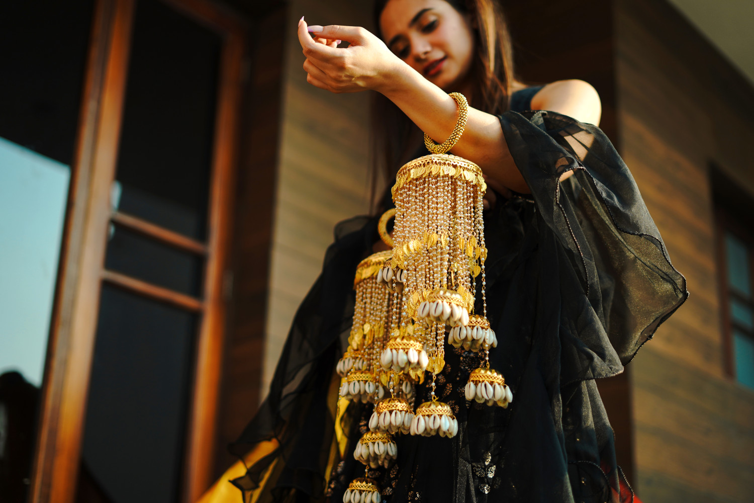 Bride is wearing shell kaleeras with the touch of pearls and the main element is the radiating golden shell caps.