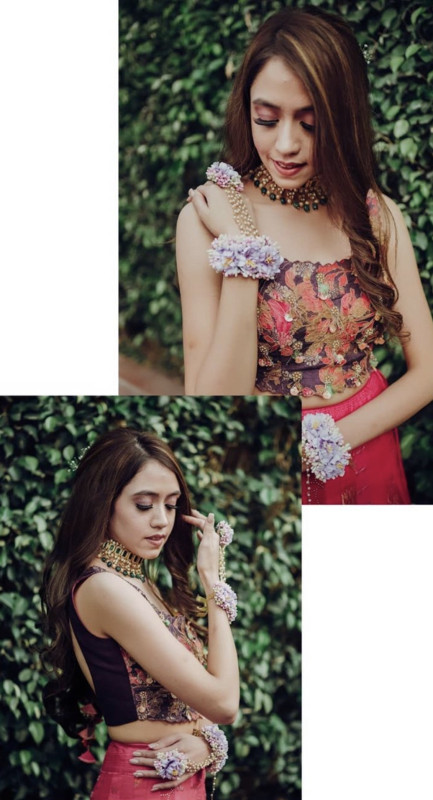 Bride is wearing floral hathphools attached with pearl chains on her Mehndi ceremony with the touch of flowers and pearls.