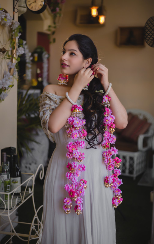Bride is wearing long pink floral kaleeras with the touch of pearls.