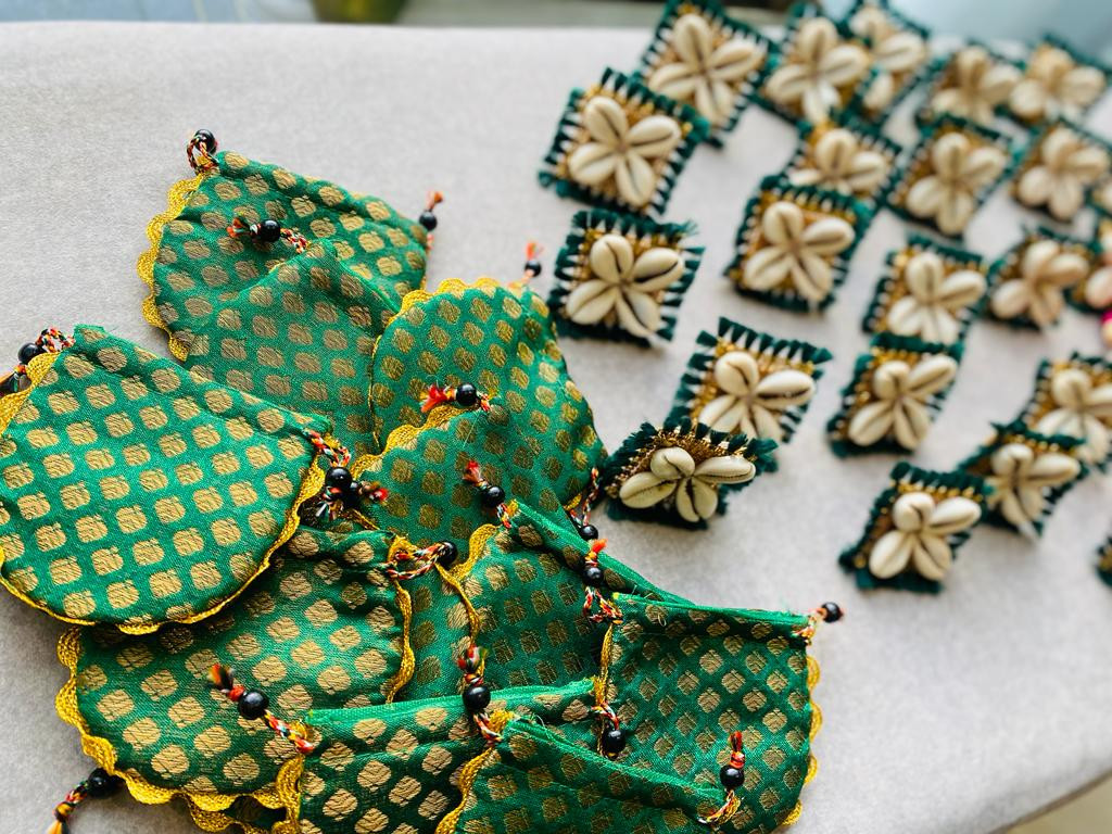 Mehndi rings with cute small potli pouches for family & friends as gifts on Mehndi ceremony.