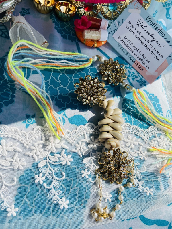 Metal shell flower Rakhi set with Bhabhi Lumba for this Raksha Bandhan .
