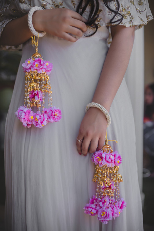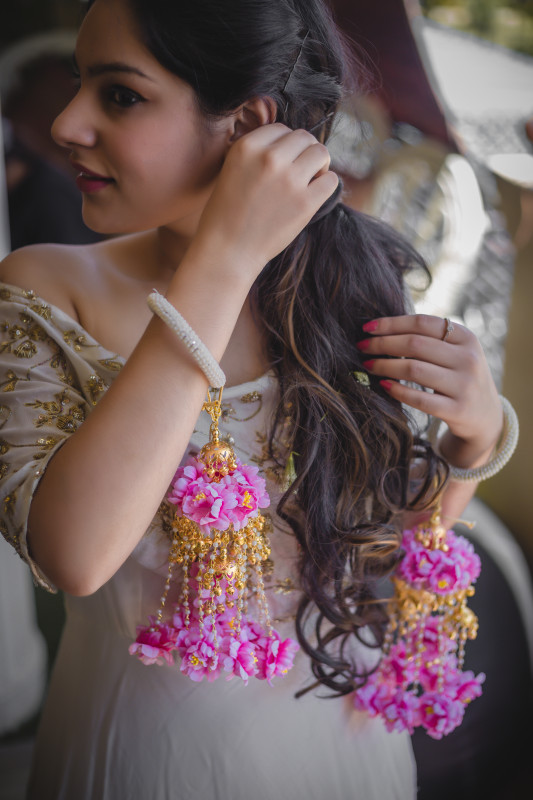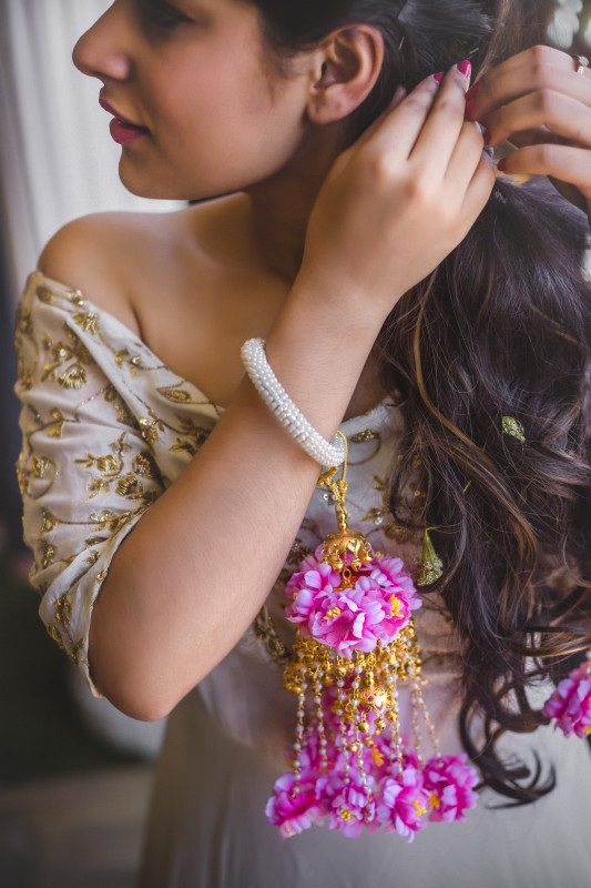 Bride is wearing minimal floral kaleeras with the touch of pearls.