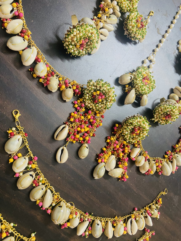 Shell jewellery consists of hathphools, mangtikka & earrings with side layers.