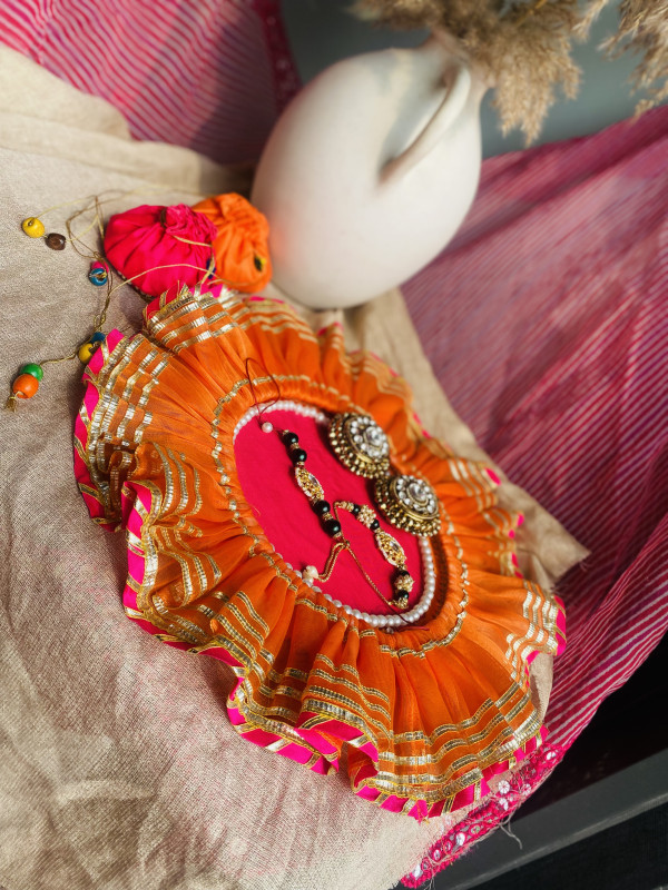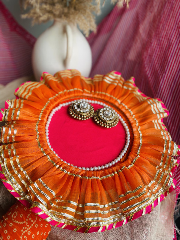 Orange frill thaal set with the touch of pearls for your loved ones.