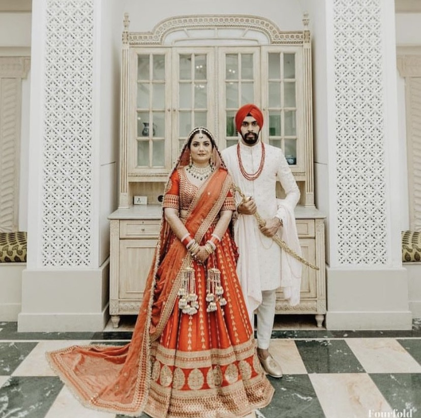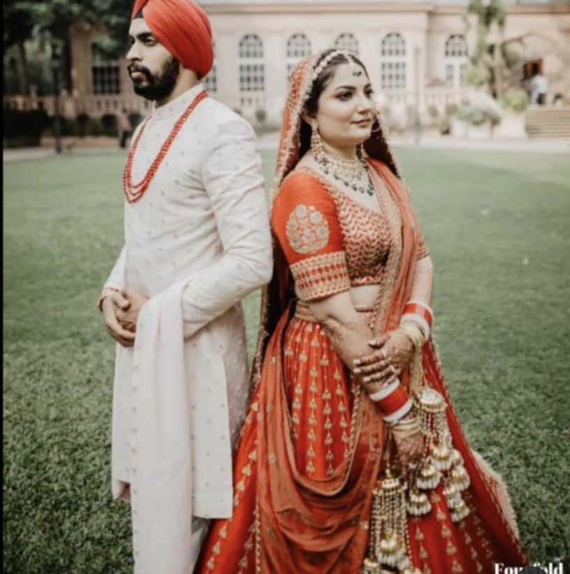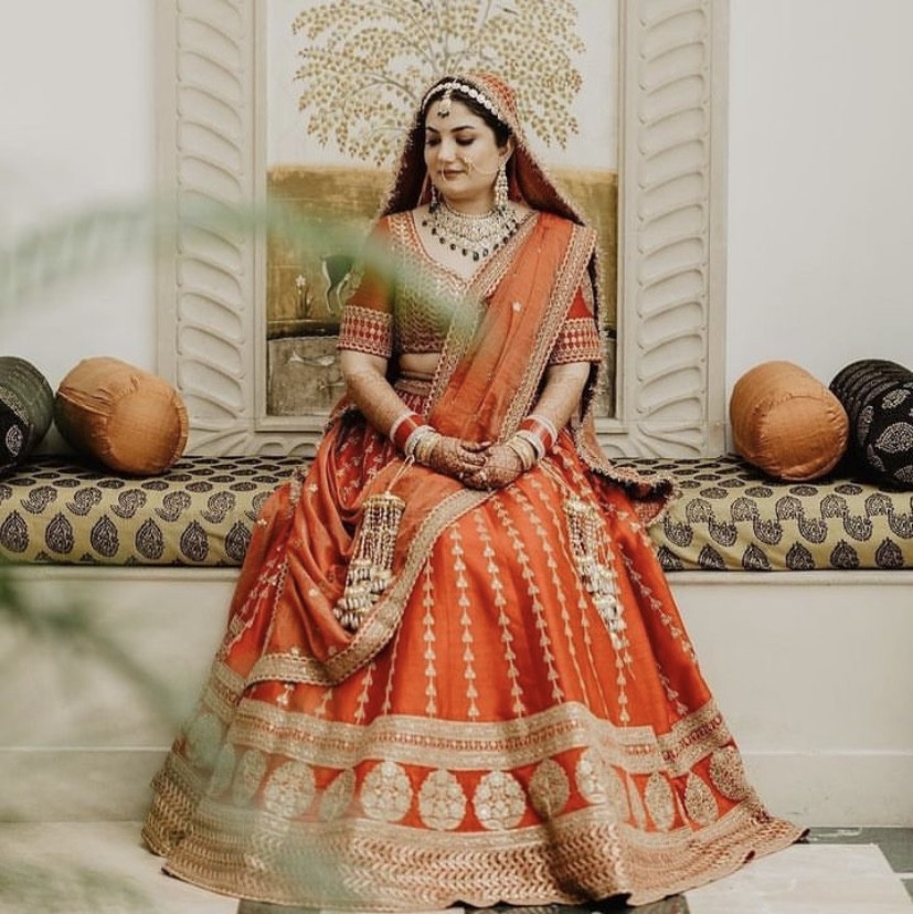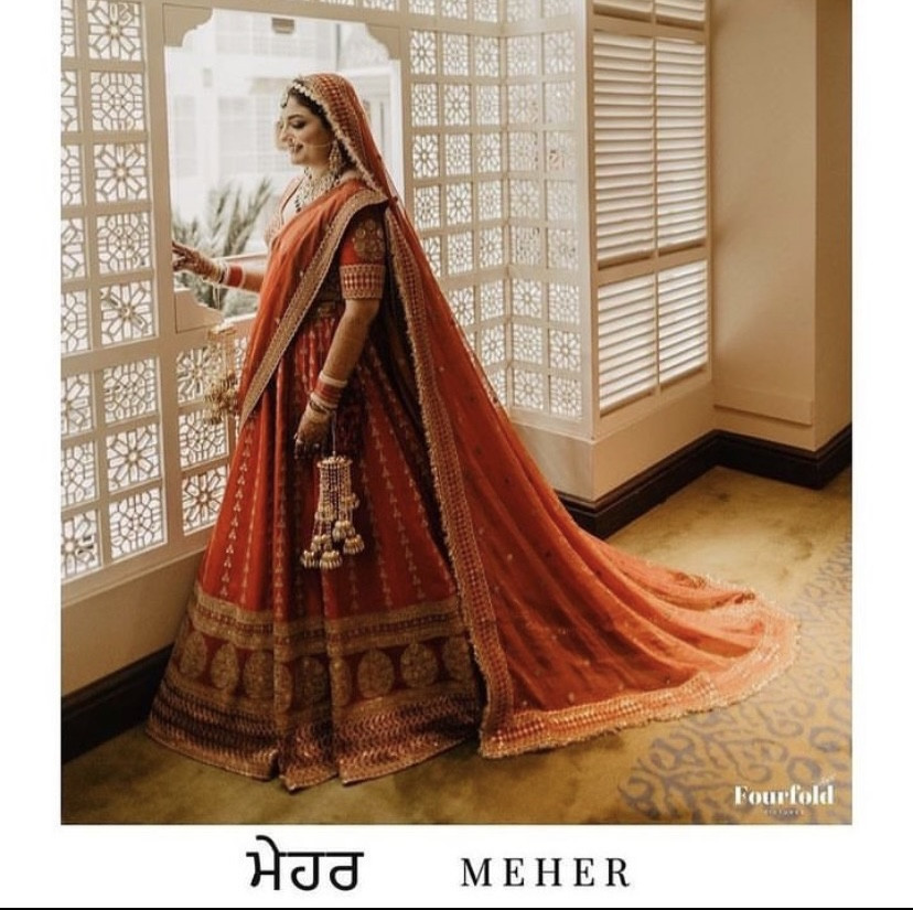 Bride is wearing punjabi traditional kaleeras with the touch of pearls and shells on her wedding day.