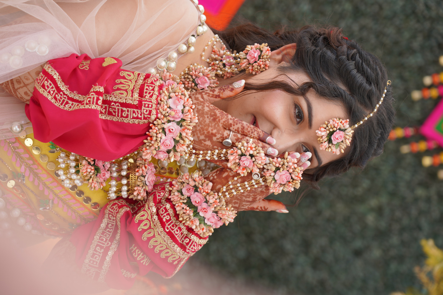 Bride is wearing floral hathphools with hangings . Choker, earrings & Mangtikka with the touch of flowers and pearls.