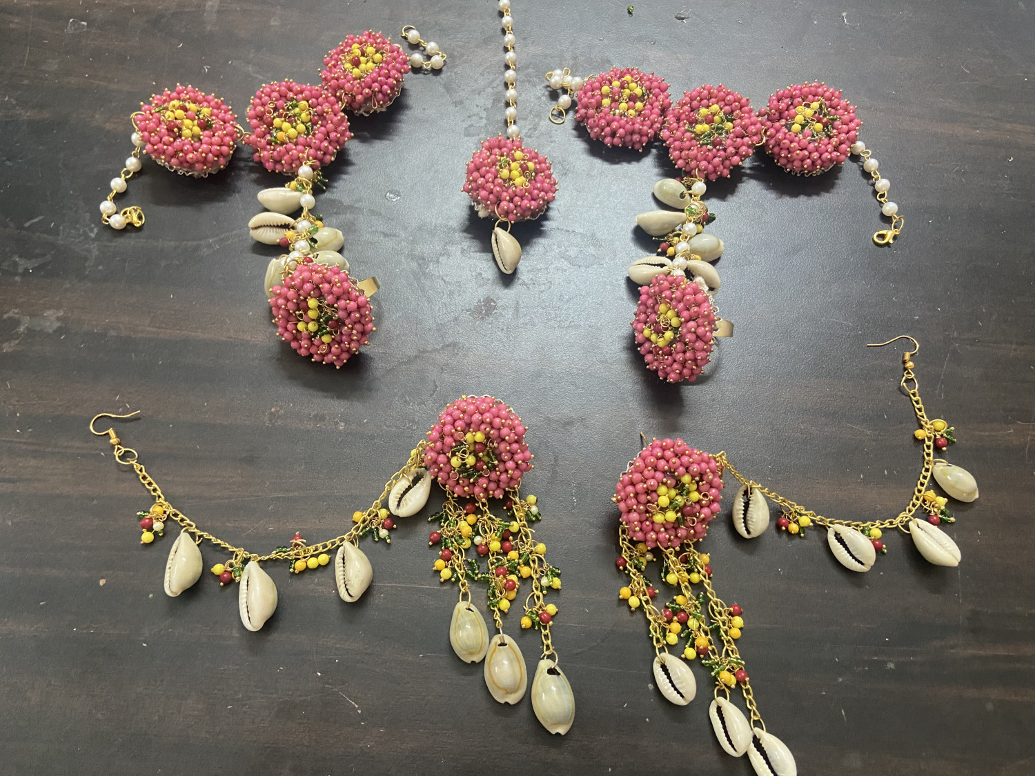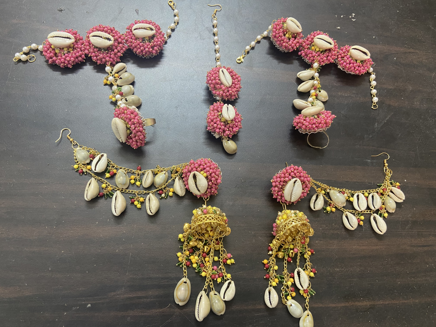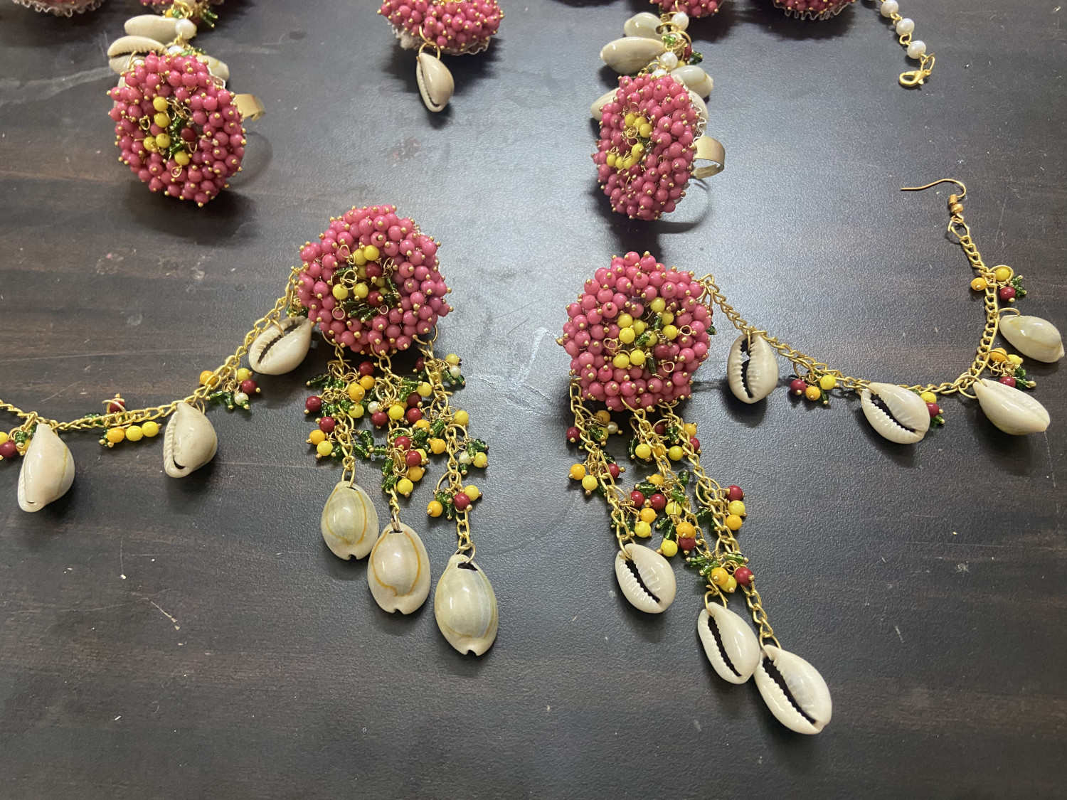 Colourful shell jewellery includes mangtikka , hathphools , anklets & earrings with side layers.