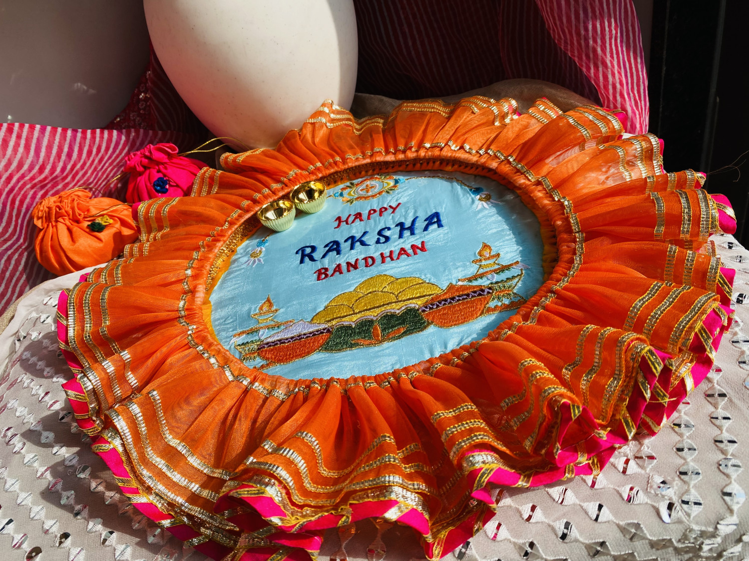 Orange frill thaal set with the touch of pearls and perfect customisation for Raksha Bandhan for your loved ones.
