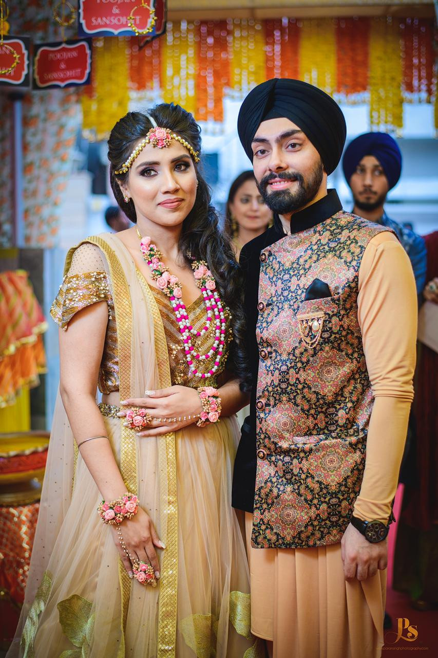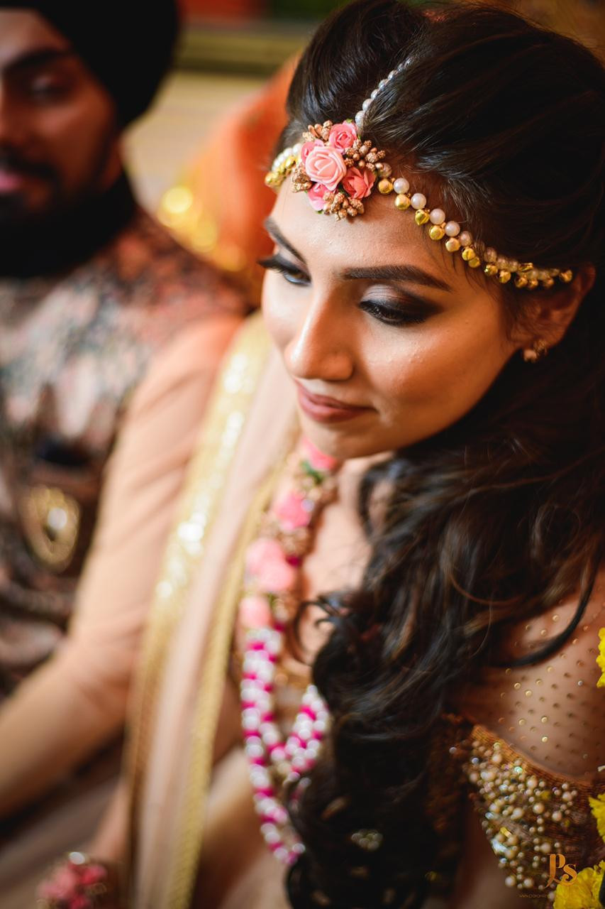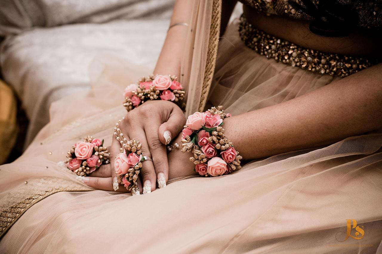 Bride wearing floral jewellery. She’s wearing necklace, Hathphools & earrings.