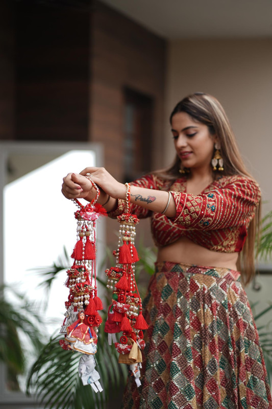 Bride is wearing Red tassel kaleeras with the touch of pearls and the main element is the DOLLS (Puppets)… male & female both.