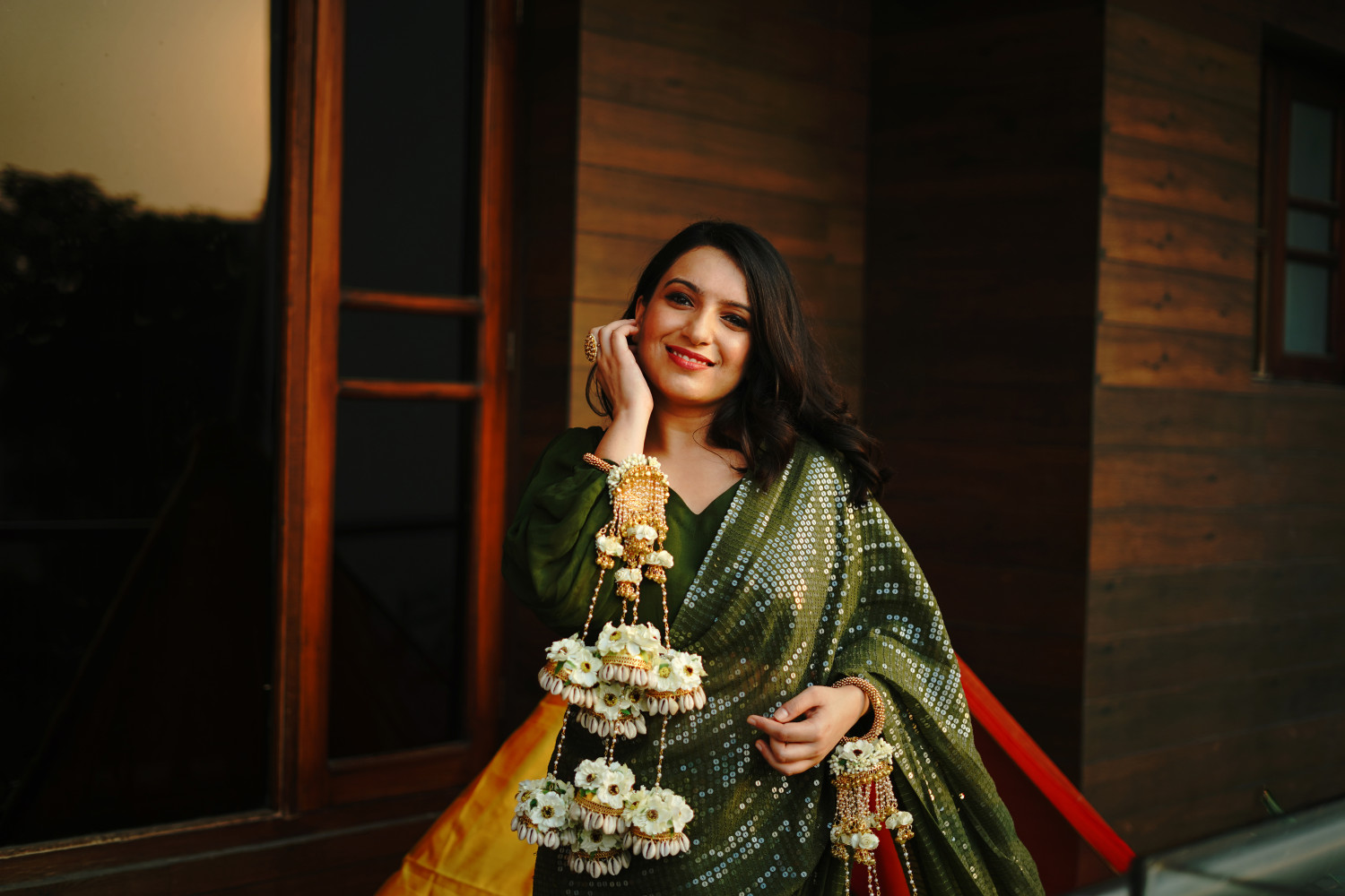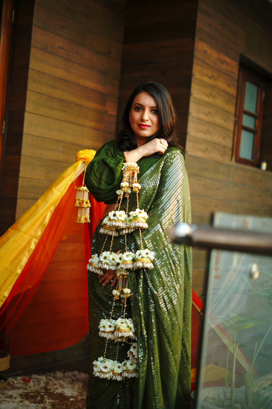 Bride is wearing minimal off white floral Kaleeras with the detailing of pearls & shells.